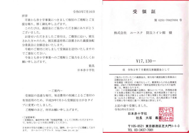 義援金の送付状 ※ (株)ユースクは、防災トイレ館の運営会社です