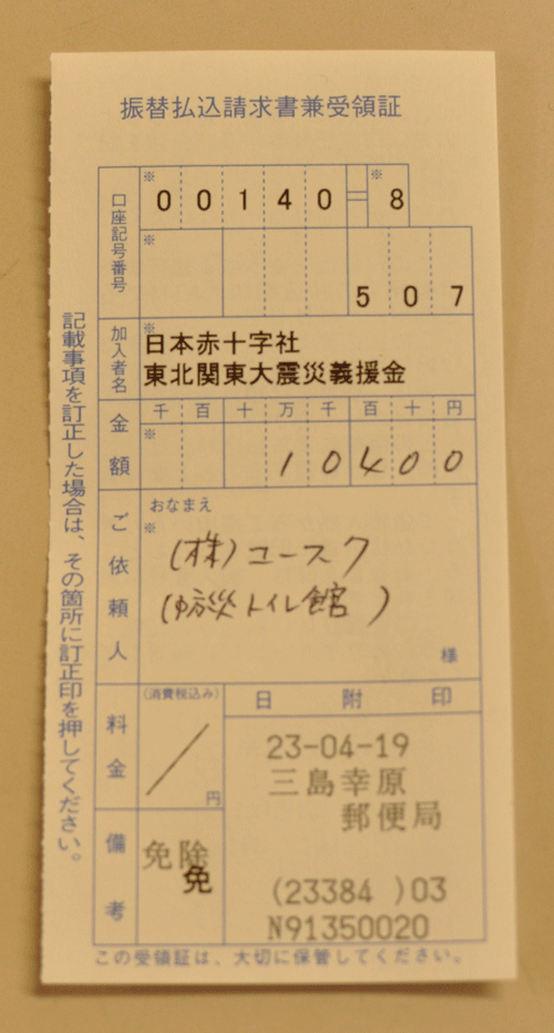 早速、平成23年3月11日から、昨日平成23年4月19日までの「サニタクリーン便袋」の売り上げを確認したところ、「10,400枚」でしたので、郵便局より日本赤十字社へ東日本大震災の義援金として、10,400円振込みをさせて頂きました。
